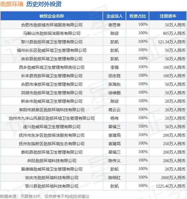 本站消息,根据天眼查APP显示,劲旅环境(001230.SZ)新增一起对外投资事件诚利和,被投资公司为合肥市劲旅城市环境服务有限公司,法定代表人谢思香,投资占比为100%。该公司从事公共设施管理业,注册资本为50万人民币。目前,劲旅环境共存在对外投资94项,投资占比前20的项目见下表: