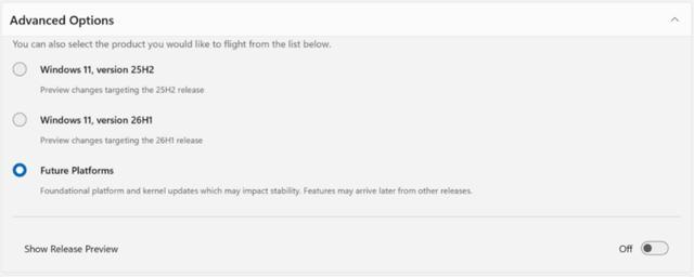 原 Canary 频道用户将根据版本号分流至 Experimental 频道下的未来平台或 26H1 版本。这些更新将在未来几周内开始向全体预览体验成员推送。